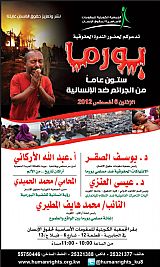 تنديدا بالمجازر الوحشية والانتهاكات المروعة التي يتعرض لها مسلمو اقليم آراكان في بورما تعقد جمعية مقومات حقوق الانسان يوم غد الاثنين العاشرة مساء ندوة حقوقية بعنوان ( اراكان .. ستون عاما من الجرائم ضد الانسانية ) وذلك بمقرها الكائن بمنطقة الجابرية ، حيث سيحاضر فيها كل من رئيس جمعية مقومات حقوق الانسان د.يوسف الصقر ورئيس قسم القانون الدولي بكلية الحقوق د.عيسى العنزي ومدير الجمعية الكويتية لحقوق الانسان الاستاذ محمد الحميدي ورئيس اللجنة الكويتية لمساعدة اقليم اراكان النائب محمد هايف المطيري ومداخلة هاتفية من أمين سر مسلمي روهانجيا الاستاذ عبدالله الاركاني من السعودية.