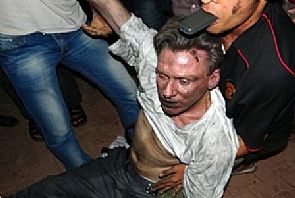 ويظهر الشريط الذي بث على الانترنت وحصلت فرانس برس على نسخة منه احد الشبان المتجمعين حول جثة السفير يقول : 'هل هناك طبيب؟' فيما يضع شاب اخر يده على عنق الضحية ليتأكد ما اذا كان لا يزال قادرا على التنفس.
