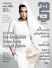 أطلّت النجمة الهوليوودية والحامل في أشهرها الأولى كيم كارداشيان على غلاف مجلة 'هي' العربية بفستان أبيض محتشم من تصميم المصمم العالمي ستيفان رولان Stéphane Rolland، إلا أن داخل المجلة ، كشفت كيم عن صدرها مع فستان رغم وضعها لطرحة بيضاء أيضاً. وقد صرّحت كيم كارديشيان كم هي سعيدة بإطلالتها العربية وبأن جلسة التصوير كانت مختلفة تماماً عن كل جلسات التصوير التي خضعت لها قبلا.