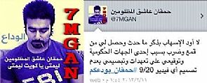 @7MGAN أو كما يطلق على نفسه حمقان عاشق المظلومين غاب بشكل مفاجيء عن التغريد منذ نحو أسبوع، وبشكل مفاجيء عاد للتغريد ليودع متابعيه وليكشف لهم عن سبب إيقاف نشاطه عن تصاميم مقاطع الفيديو والتصوير ليقول: أقسمت على نصرتكم يا بدون الكويت ولم أتفانى بذلك فسامحوني، لا أود الإسهاب بذكر ما حدث وحصل لي من قمع وضرب بسبب إحدى الجهات الحُكومية وتوقيعي على تعهدات وتبصيمي بعدم تصميم أي فيديو .