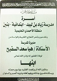 تتقدم أسرة مدرسة زياد بن لبيد - الابتدائية - بنين في منطقة الأحمدي التعليمية بأحر التعازي القلبية والمواساة من مديرة المدرسة - الأستاذة / هيا سعد السفيح لوفاة المغفور له بإذن الله تعالى ابنها، سائلين الله أن يتغمد الفقيد بواسع رحمته، ويسكنه فسيح جناته ويلهم أهله وذويه الصبر والسلوان.