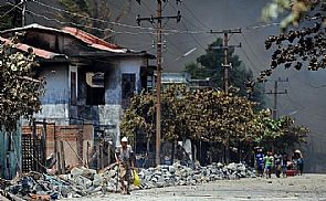 وحولت أعمال العنف اجزاء من المدينة الواقعة شمال العاصمة نايبيداو إلى رماد في حين تجهد السلطات الى فرض سيطرتها بعد ثلاثة أيام من المواجهات والحرائق، ويمنح فرض حال الطوارئ الجيش صلاحيات كبيرة وهو يشمل ميكتيلا وثلاث بلدات أخرى محيطة بها، وأعلن مصدر في الشرطة ان حصيلة الضحايا بلغت 'عشرين قتيلا على الاقل.. نخشى أن تكون أعلى لأنه من الصعب علينا احصاء القتلى'.