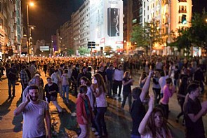 وتدفق المتظاهرون بالآلاف إلى ساحة تقسيم مجدداً رافعين الأعلام التركية وهاتفين 'طيب ارحل'.