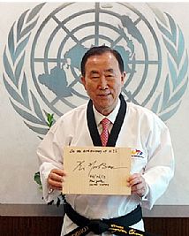 حصل الأمين العام للأمم المتحدة بان كي مون على الحزام الأسود الشرفي من الدرجة العاشرة للتايكوندو (فن القتال الكوري الشهير).