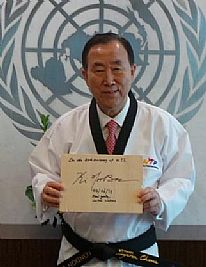 منح رئيس الإتحاد العالمي للتايكوندو 'تشو تشونج وون' الأمين العام للمنظمة الدولية 'بان كي مون'(68 عاما) الحزام الاسود في'التايكوندو'، ورأى أنه سعيد بالأمر إذ يعكس الأهداف التي يتشارك فيها الإتحاد مع المنظمة الدولية.
