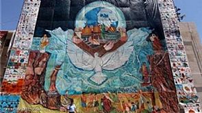 وأضاف أن هذه اللوحة تمثل العالم بقلب القدس الشريف، والتي تضم أبناء البشر أجمعين، واللوحة تصل مساحتها إلى 310 متر مربع بارتفاع 15 مترا وعرض 20 مترا.