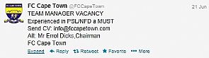 في واقعه طريفة وجديدة في عالم كرة القدم أقدم نادي كيب تاون الجنوب أفريقي على خطوة قد تكون الأولى في تاريخ كرة القدم عندما أعلن على موقعه الرسمي على تويتر عن حاجته لعدد ١ مدير فنى بشرط الخبرة ، وعلى من يجد في نفسه الكفاءه أن يرسل سيرته الذاتية على ايميل رئيس النادي.