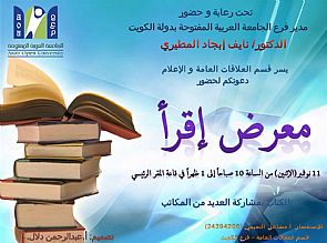 من جهة أخرى وعلى الصعيد ذاته كشف العنزي أن الجامعة تقوم بالاعداد لإقامة معرض ' إقرأ ' بمشاركة مختلف مكاتب الكويت ودور النشر والمزمع إقامته يوم 11 نوفمبر بمقر الجامعة بمنطقة العارضية الصناعية مرحبين بكافة دور النشر والمكتبات الراغبة بالتسجيل في معرض إقرأ .