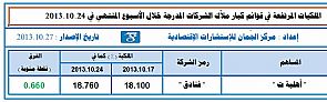 اقتصرت حركة الملكيات المعلنة في قوائم كبار ملاّك الشركات المدرجة في سوق الكويت للأوراق المالية على ثلاث حركات فقط خلال الأسبوع الماضي المنتهي في 24/10/2013 ، وذلك بحركة واحدة لكل من الرفع والخفض والخروج ، حيث غابت عمليات الدخول في القوائم المذكورة ، وقد يرجع ذلك الفتور في حركة الملكيات المعلنة خلال الأسبوع المشار إليه إلى أنه جاء عقب عطلة طويلة نسبياً امتدت لتسع أيام بمناسبة عطلة عيد الأضحى المبارك .