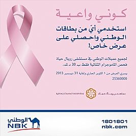 ويقدم البنك الوطني لكافة عميلاته وموظفاته خصما خاصا على فحص الماموغرام الثنائية بالتعاون مع مستشفى رويال حياة، وذلك لغاية 31 ديسمبر المقبل.