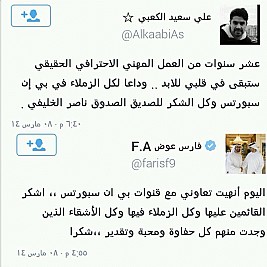 وقال فارس عوض عبر حسابه بالتويتر، حيث قال عوض 'اليوم أنهيت تعاوني مع قنوات بي ان سبورتس ،، اشكر القائمين عليها وكل الزملاء فيها وكل الأشقاء الذين وجدت منهم كل حفاوة ومحبة وتقدير ، شكرا لمدير القنوات السيد ناصر الخليفي على كل شي وللأخ عبد العزيز المري وابراهيم والجميع على تعاملهم الراقي ولأخوي الغالي محمد سعدون الف شكر، شكرا لكل مشاعركم واسأل الله التوفيق لي ولكم في كل الخطوات ،، عاجز عن الرد المينشن يحترق ،، مستمر معكم ان شاء الله عبر دبي الرياضية'.