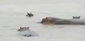 تحول فرس نهر إلى بطل على مواقع التواصل الاجتماعي بعدما أنقذ ظبياً إفريقياً من أنياب تمساح ضخم كان قد بدأ لتوه في سحبه لأعماق النهر رغبة في افتراسه.