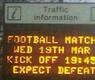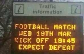 وفي تفاصيل الصورة التي تضعها شركات المقاولات أثناء أعمال الصيانة للطرق ، اختار المشجعون هذه اللافتة لأن يكتبوا عليها : مباراة كرة قدم في ال19 من مارس ، عند الساعة الثامنة إلا ربع بالتوقيت المحلي، توقعوا الخسارة .