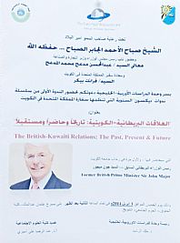 تحت رعاية حضرة صاحب السمو أمير البلاد المفدى الشيخ صباح الأحمد الجابر الصباح حفظه الله ورعاه تقيم وحدة الدراسات الأوروبية – الخليجية في كلية العلوم الاجتماعية بجامعة الكويت وبحضور سعادة سفير المملكة المتحدة في الكويت سعادة السفير السيد فرانك بيكر حلقة نقاشية بعنوان: 'العلاقات البريطانية الكويتية: تاريخاً وحاضراً ومستقبلاً '، ضمن سلسلة ندوات 'ديكسون' التي تنظمها سفارة المملكة المتحدة في الكويت، ويحاضر فيها لأول مرة في رحاب جامعة الكويت رئيس الوزراء البريطاني السابق السيد جون ميجور، وذلك يوم الخميس الموافق 3/4/2014 في تمام الساعة 2 ظهراً على مسرح عثمان عبدالملك الصالح بكلية الحقوق – الحرم الجامعي الشويخ.