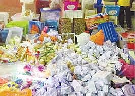وقال مراقب اشغالات الطرق في فرع بلدية محافظة حولي خالد العازمي في تصريح صحافي عقب تنفيذ حملة اليوم على الباعة المتجولين ان فريق الحملة صادر حمولة اربع شاحنات من الخضراوات والفواكه و280 صندوقا من (البنك والترمس) و39 صندوقا من المياه الغازية والمخللات والفقع و290 صندوقا من المكسرات و384 صندوقا من الحلوى بالاضافة الى 2900 قرص مدمج.