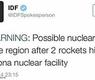 وكتب على صورة للرسالة نشرها الموقع الإلكتروني لصحيفة يديعوت أحرونوت '#تحذير: تسرب نووي محتمل بعد إصابة منشأة ديمونا النووية'.