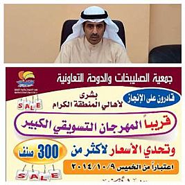 أعلن أمين رئيس جمعية الصليبخات والدوحة التعاونية مطلق الحريجي عن انطلاقة المهرجان التسويقي الكبير في الاسواق المركزية ابتداءا من 10/9 ، يشمل اكثر من 300 صنف مخفض بالتعاون مع أضخم الشركات التسويقية والضخمة وذات الجودة العالية في السلع بالسوق المحلي ، مبينا ان المهرجان يأتي مشاركة بالفرحة من مجلس الادارة للمساهمين ورواد الجمعية بخصوص عيد الاضحى المبارك.