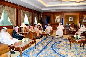 استقبل نائب رئيس مجلس الوزراء ووزير الداخلية وزير الأوقاف والشئون الإسلامية بالوكالة الشيخ / محمد الخالد الحمد الصباح في مكتبه بمقر وزارة الداخلية صباح اليوم الخميس الموافق 16/10/2014, سمو الامير الدكتور / عبد العزيز بن بدر السعود نائب رئيس جهاز الاستخبارات العامة بالمملكة العربية السعودية الشقيقة والوفد الأمني المرافق له .