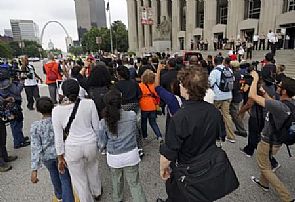 في يوم العصيان المدني الذي دعا إليه نشطاء احتجاجا على إطلاق النار على براون وغيره من الرجال السود العزل في جميع أنحاء الولايات المتحدة من قبل الشرطة قال مكتب المدعي العام الأمريكي للمنطقة الشرقية لولاية ميزوري إن 57 شخصا اعتقلوا لأنهم اخترقوا الحواجز عند محكمة في سانت لويس وسدوا مدخلها.