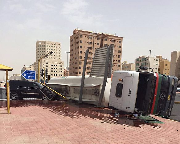 تمكن رجال الإطفاء من السيطرة على انقلاب صهريج وقود محمل بالكامل بالمشتقات النفطية القابلة للإشتعال بسرعة عالية وذلك بعد تلقي مركز عمليات الإدارة العامة للإطفاء بلاغ عن وجود انقلاب الصهريج بمنطقة الرقعي وتحديداً بالتقاطع الذي يربط بين منطقتي الرقعي والأندلس وعليه تم توجيه ٣ مركزا إطفاء بقيادة المقدم نواف الشافي اولهم مركز إطفاء العارضية ومن ثم مركز إطفاء المواد الخطرة ومركز الإسناد وعند وصول رجال الإطفاء تبين ان كميات كبيرة من الوقود سالت في الشارع وقام رجال الإطفاء بمنع المزيد من التسرب وإيقاء الكيات الهائلة المتسربة من الوقود وذلك من خلال اغلاق المناهيل الخاصة بالصهريج لاتجنب المزيد من الإهدار والحد من خطورته وتم ابلاغ الجهات المختصة مثل النقل العام لسحب البنزين المتبقي في الصهريج وتعديلها لوضعها الطبيعي وذلك لنقلها وابعادها عن الشارع الرئيسي .