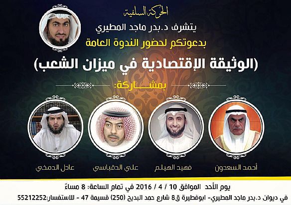 دعت الحركة السلفية جموع المواطنين لحضور ندوة عامة تحت عنوان الوثيقة الاقتصادية في ميزان الشعب، وذلك يوم الاحد المقبل في الساعة الثامنة مساء بديوان د. بدر ماجد المطيري، في منطقة ابو فطيرة قطعة ٨ شارع حمد البديح ٢٥٠ قسيمة ٤٧.