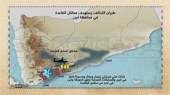 قصفت طائرات التحالف العربي مواقع وتجمعات، لعناصر تنظيم 'القاعدة' في مدينتي زنجبار وجعار بمحافظة أبين اليمنية.