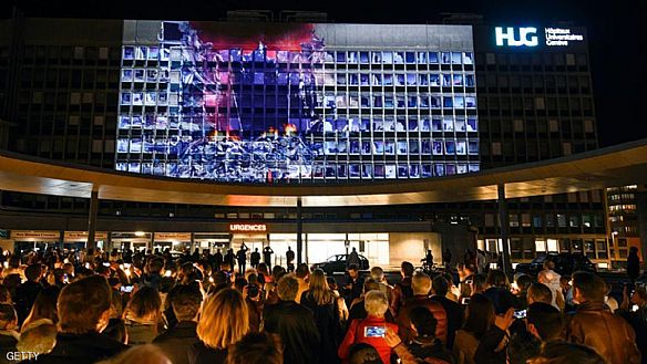 وتمت إضاءة المستشفى السويسري، الذي تلقى وزير الخارجية الأميركي جون كيري العلاج فيه من كسر في عظم الفخذ في مايو 2015، لمحاكاة قصف طائرات له.