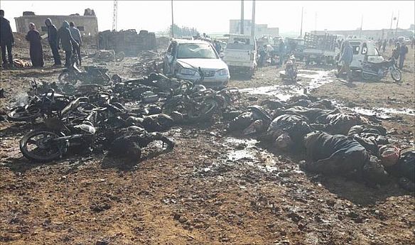 قال مراسل الجزيرة في سوريا نقلا عن مصادر طبية إن 45 مدنيا على الأقل قتلوا، وجرح نحو سبعين في انفجار سيارة ملغمة وسط تجمع للمدنيين في قرية سوسيان بالقرب من مدينة الباب بريف حلب الشرقي، في حين شنت قوات النظام قصفا صاروخيا مكثفا على حي القابون بـدمشق، وأحياء سكنية في دوما وحرستا وسقبا بالغوطة الشرقية بريف دمشق. وذكرت المصادر أن عشرات الجثث متفحمة ولم يتم التعرف إليها بسبب الانفجار العنيف. وقد نشر ناشطون صورا تظهر عشرات القتلى. وقال مراسل الجزيرة في غازي عنتاب أمير العباد إن عدد القتلى مرشح للزيادة بسبب كثرة وخطورة الإصابات التي وصلت إلى المستشفيات القريبة من مكان الحادث الذي وقع قبل أن تصل السيارة الملغومة إلى حاجز عسكري قريب. من جهة أخرى ذكر ناشطون:أن غارات جوية للنظام قد استهدفت بلدة تير معلة بريف حمص الشمالي، دون الإشارة إلى نتائجها., وفي ريف دمشق، قال مراسل الجزيرة إن حي القابون الواقع شمال شرق دمشق تعرض لقصف عنيف بالصواريخ، حيث يتمتع الحي (مع حي تشرين) بأهمية إستراتيجية باعتباره بوابة للعاصمة يبعد عن مركزها أربعة كيلومترات فقط، وهويشكل همزة وصل بين الغوطة المحاصرة شرق العاصمة وأحياء المعارضة جنوبها. من جهة أخرى، سقط عدد من الجرحى في صفوف المدنيين جراء شن الطيران الحربي غارات جوية عدة على مدينة حرستا بالغوطة الشرقية، استخدمت في بعضها صواريخ محملة بمادة النابالم، مما أدى لسقوط العشرات من الجرحى، وفق ما أكده ناشطون. وفي الغوطة الشرقية، قال مراسل الجزيرة إن اشتباكات عنيفة اندلعت بين قوات النظام والمعارضة المسلحة على أطراف بلدة المحميدية بعد محاولة قوات النظام التسلل لمواقع المعارضة في المنطقة، تبعها قصف مدفعي استهدف البساتين ومواقع أخرى تابعة للمعارضة. من جهة أخرى، أكدت مصادر المعارضة المسلحة أنها تصدت لهجوم مضاد شنته قوات النظام السوري على مدينة درعا، في محاولة لاستعادة مواقع من المعارضة المسلحة. وقال ناشطون إن أحياء درعا البلد وطريق السد والمنشية تعرضت أمس الخميس للقصف بعشرات البراميل المتفجرة وصواريخ أرض-أرض من طراز 'فيل'، مما أسفر عن قتيل وجرحى، كما قتل ثلاثة في غارات على بلدة بصرى الشام، وآخر في بلدة الجيزة بريف درعا. جبهات مختلفة وفي جبهات أخرى، أفاد ناشطون بأن قوات النظام جددت قصفها على مناطق في حي الوعر المحاصر بمدينة حمص، حيث يشهد الحي تصعيدا منذ أكثر من أسبوعين أسفر عن مقتل 33 شخصا. وفي الريف الشرقي لحمص، تتواصل المعارك في محاور عدة ببادية تدمر بين تنظيم الدولة الإسلامية وقوات النظام والمسلحين الموالين لها، وسط تقدم لقوات النظام . وفي حلب دارت اشتباكات بين النظام والمعارضة في محاور البحوث العلمية والراشدين وسوق الجبس، وسط غارات جوية وقصف مدفعي استهدف بلدات بريف حلب الغربي، بينها عنجارة، كما استهدف القصف منطقة الملاح (شمال المدينة). وفي حماة، استهدفت الفصائل بالرشاشات المتوسطة والثقيلة لقوات النظام في بلدة محردة والمحطة الحرارية بريف حماة الشمالي، بينما قتل شخص جراء قصف جوي تعرضت له مناطق في جبل بلعاس بريف حماة الشرقي. وتحدثت المعارضة عن غارات جوية للنظام على بلدات بريف حماة الشمالي، وأسفرت إحدى الغارات عن مقتل خمسة مدنيين في قرية الجابرية بالريف الشمالي الغربي، وردت المعارضة المسلحة بقصف مواقع لقوات النظام في بلدات موالية له بريف حماة.