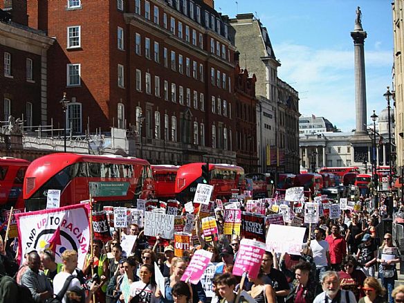 وانتقد المتظاهرون تلقي ماي الدعم من الحزب 'الديمقراطي الوحدوي' اليميني المتطرف في أيرلندا الشمالية (DUP). كما انتقدوا سياسات الأحزاب المحافظة ومواقفها من المرأة والمثليين، مرددين هتافات مناهضة لرئيسة الوزراء المكلفة وحزبها، من قبيل 'لترحل ماي' و'ليرحل المحافظون'.
