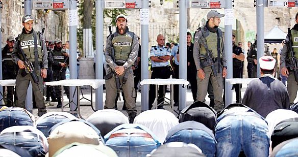 رفض مئات المصلّين الفلسطينيين، امس، الخضوع للإجراءات الأمنية المشدّدة، التي شرعت سلطة الاحتلال الإسرائيلي بتنفيذها في البلدة القديمة في القدس، وداخل الحرم، بعد فتح أبوابه، حيث وضعت قيوداً أمام حرية دخول المصلّين والزوار والسياح، بعد يومين من إغلاق المسجد الأقصى، ومنع إقامة الصلاة ورفع الأذان منه، إثر العملية التي وقعت الجمعة، وأسفرت عن استشهاد منفذيها الثلاثة ومقتل شرطيَين إسرائيليَين.
