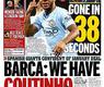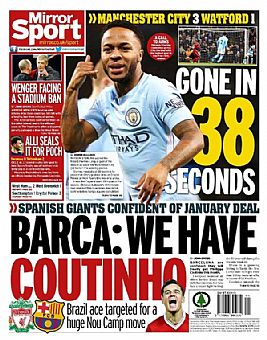 افتتح سترلينج التسجيل في المباراة بالدقيقة الأولى، لتخرج صحيفة 'ميرور' بعنوان 'ذهب في 38 ثانية'، وأشارت الصحيفة في خبر آخر إلى ثقة برشلونة في إمكانية إنجاز صفقة التعاقد مع نجم ليفربول فيليب كويتينو في أسرع وقت ممكن.