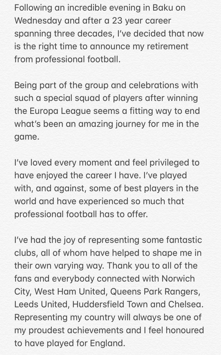 وغرد على تويتر اليوم الجمعة: "الاحتفالات مع مجموعة مميزة من اللاعبين بعد الفوز بالدوري الأوروبي، تبدو طريقة مناسبة لإنهاء رحلة مذهلة بالنسبة لي في اللعبة".