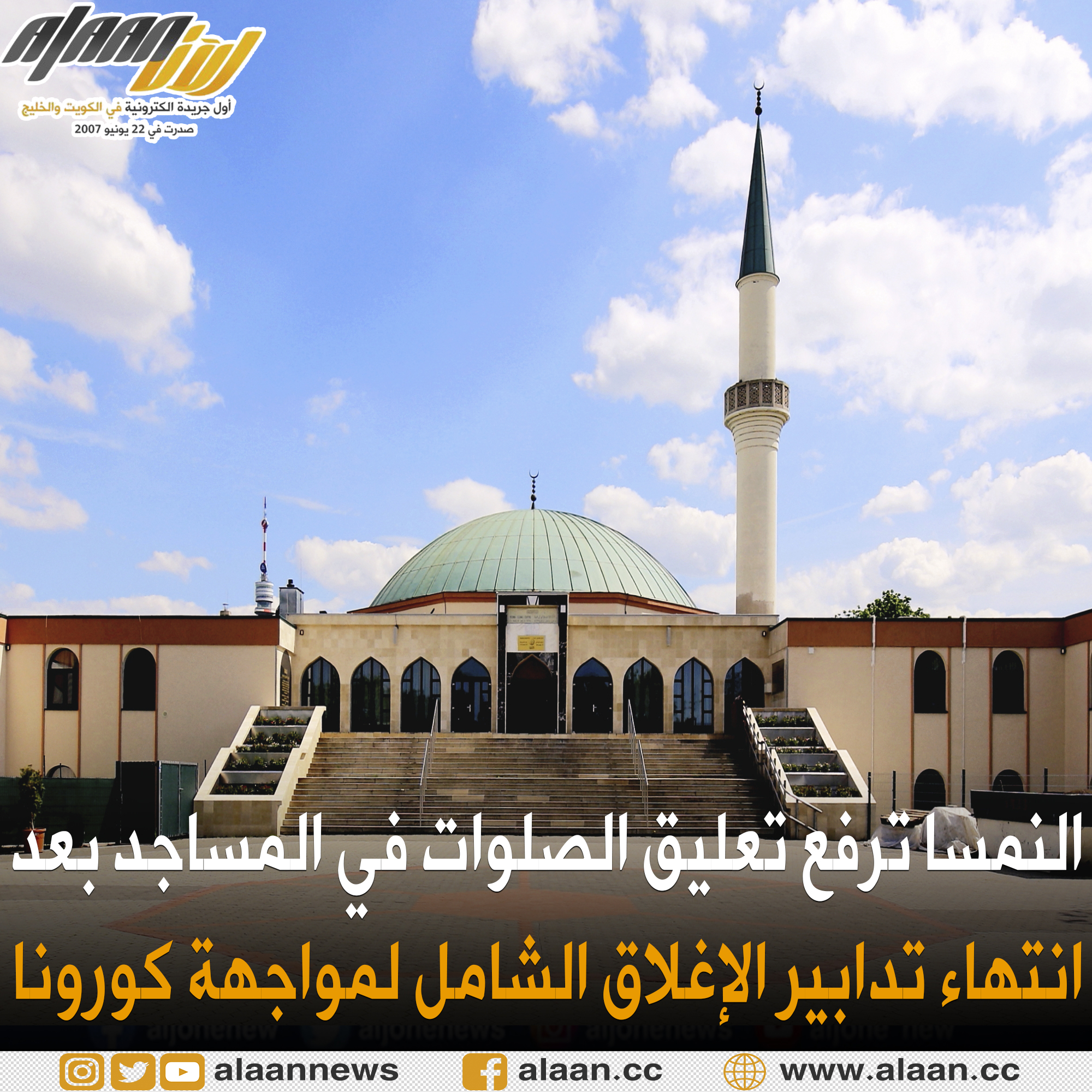 قررت الهيئة الاسلامية في النمسا اليوم الاحد رفع تعليق اداء الصلوات في كافة المساجد ابتداء من يوم غد الاثنين وذلك بعد انتهاء تدابير الاغلاق الشامل لمواجهة فيروس (كورونا المستجد - كوفيد 19).