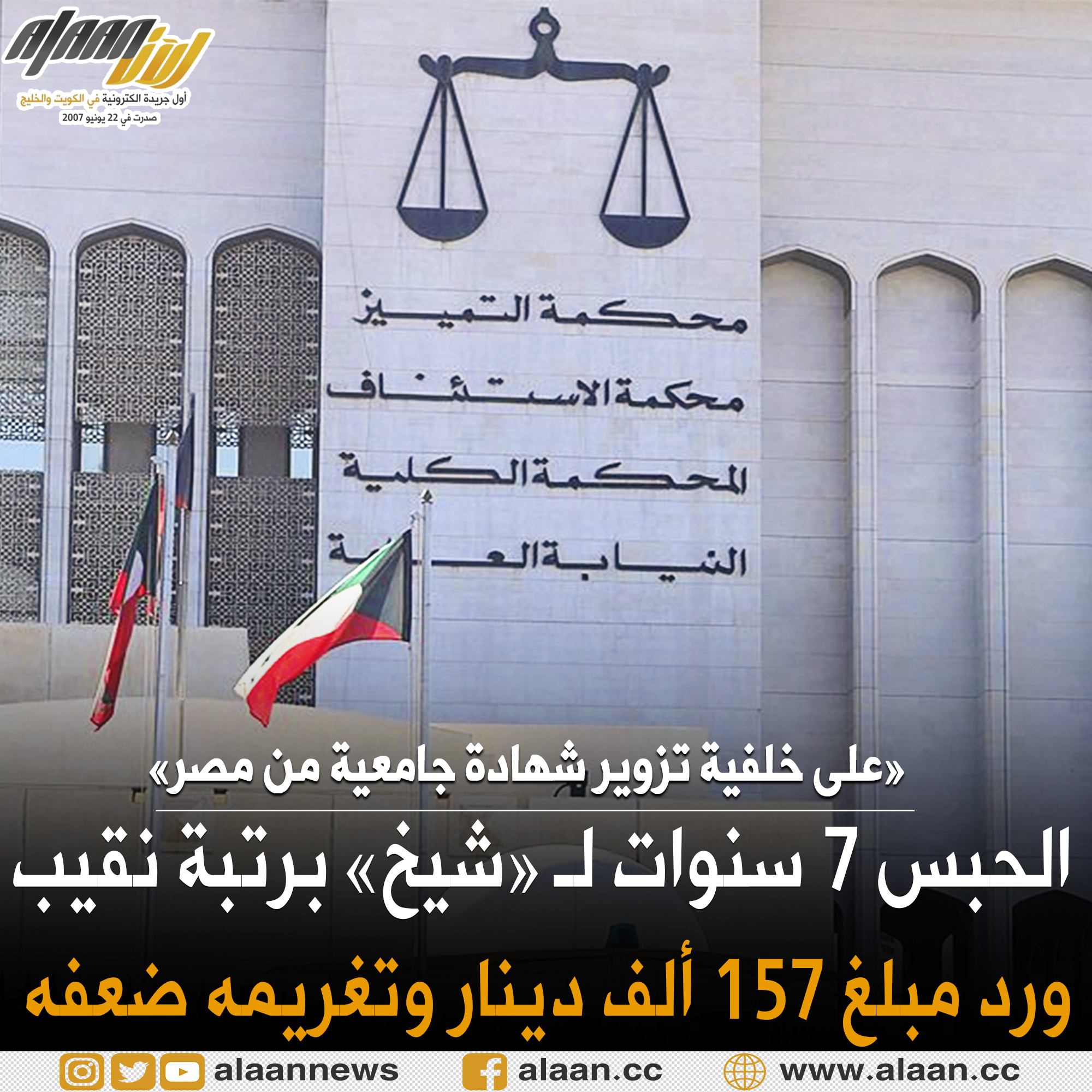 قضت محكمة الجنايات بحبس شيخ يعمل نقيبا في وزارة الداخلية، 7 سنوات مع الشغل والنفاذ ورد مبلغ 157 ألف دينار وتغريمه ضعف المبلغ في قضية تزوير شهادة جامعية من #مصر