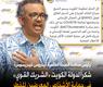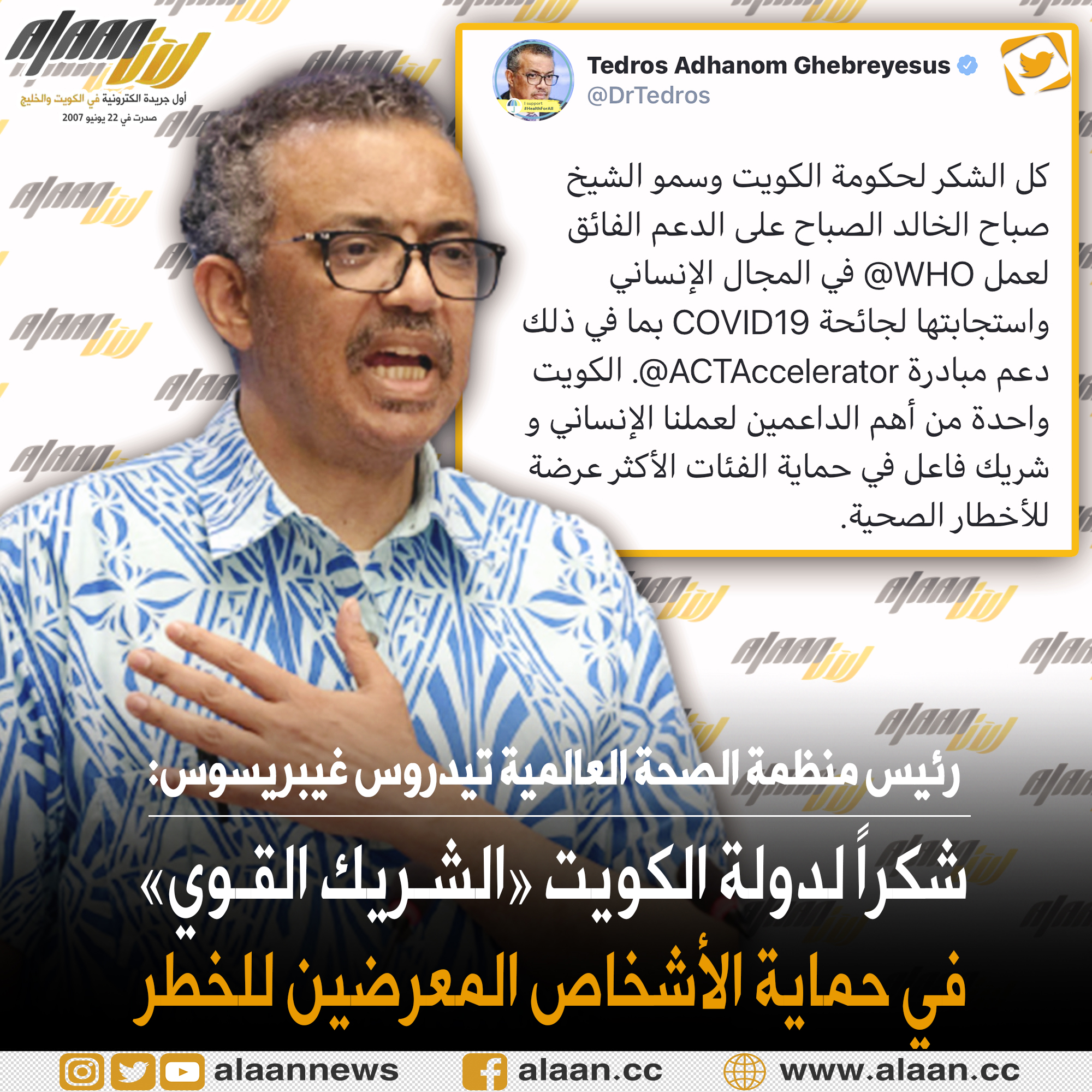 وجه رئيس منظمة الصحة العالمية تيدروس أدهانوم غيبريسوس الشكر لحكومة الكويت وسمو رئيس مجلس الوزراء الشيخ صباح الخالد على الدعم القوي لأعمال المنظمة الإنسانية، بما في ذلك مبادرة تسريع إتاحة أدوات مكافحة كوفيد-19.