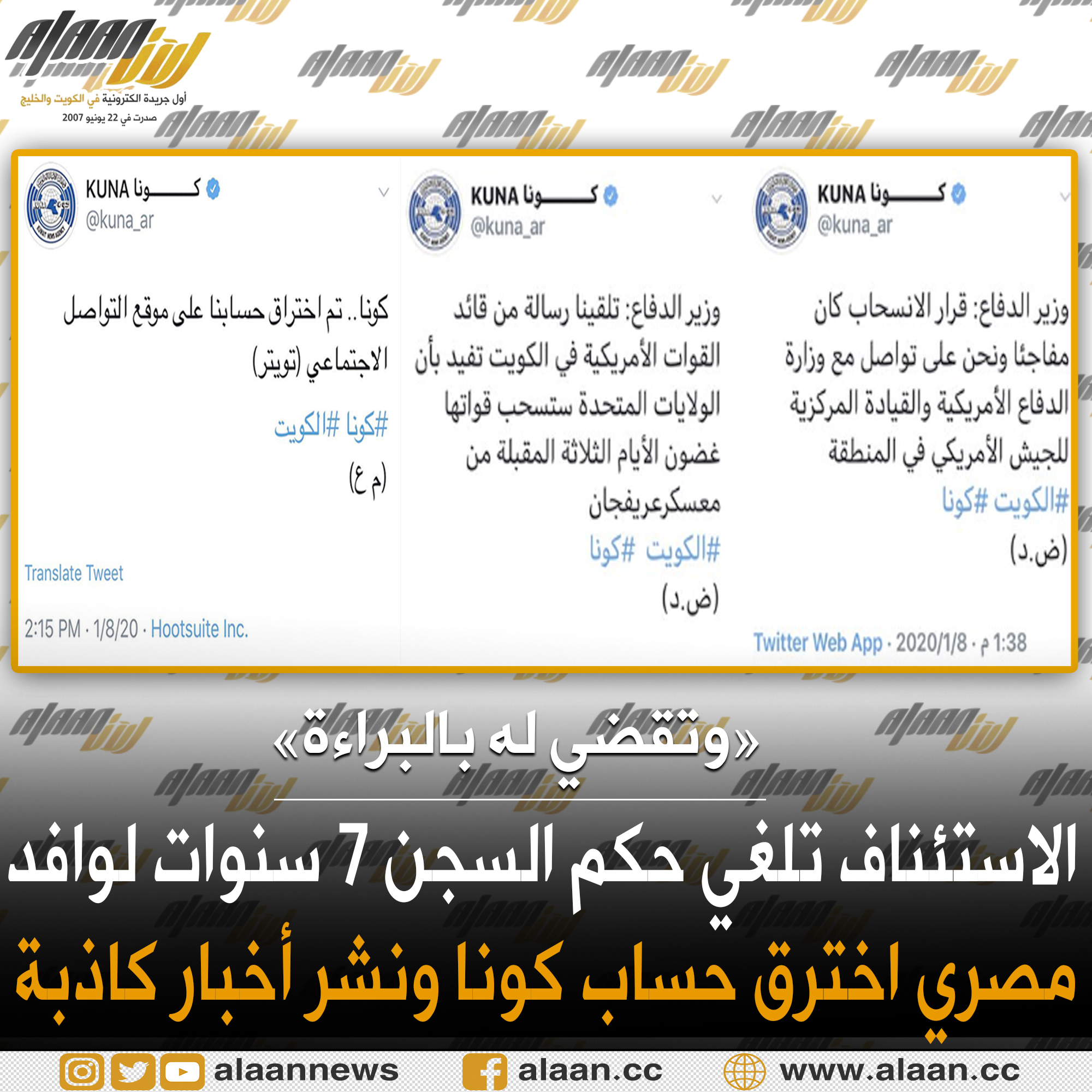#عاجل #محكمة_الاستئناف تبرئ #مصري من اختراق موقع #كونا واذاعة أخبار كاذبة وبث خبر انسحاب #القوات_الامريكية من #الكويت وتلغي حكم السجن 7 سنوات الصادر مسبقاً بحقه