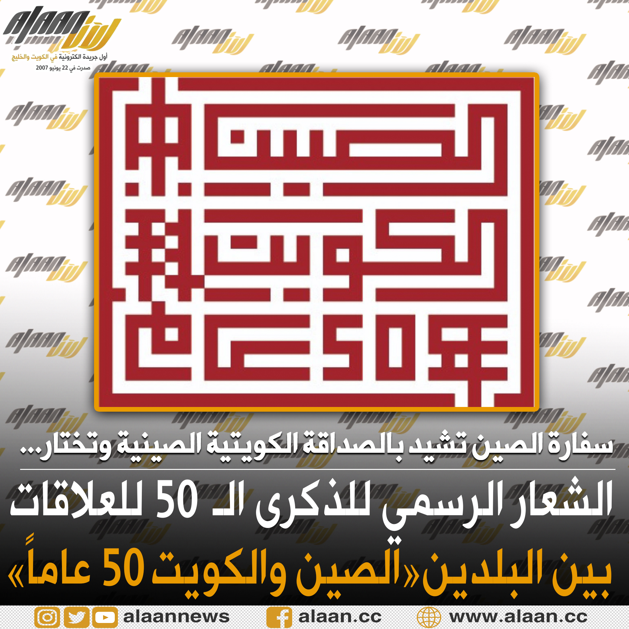 سفارة #الصين الشعبية في #الكويت تشيد بمتانة العلاقات الكويتية الصينية وبمناسبة الذكرى #الخمسين لتبادل التمثيل الدبلوماسي بينهما تختار الشعار الرسمي للذكرى ويتمثل بختم أحمر يحمل كتابة «الصين والكويت 50 عاما» بالخطين العربي والصيني