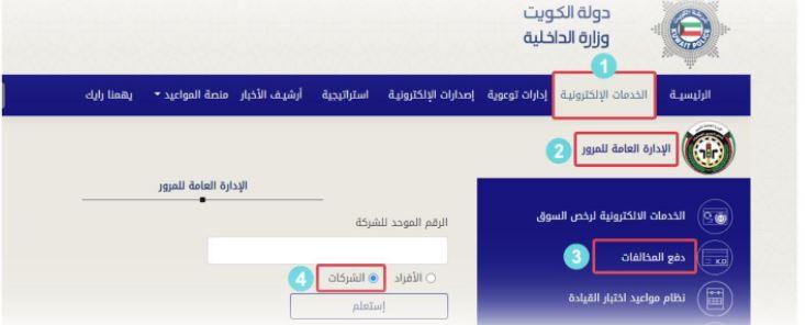 قامت الإدارة العامة لنظم المعلومات وإطلاق خدمة دفع المخالفات المرورية للشركات عبر موقع وزارة الداخلية الإلكتروني ( www.moi.gov.kw ) ، وذلك استكمالا لتطوير كافة الالانظمة وخدمات وزارة الداخلية.