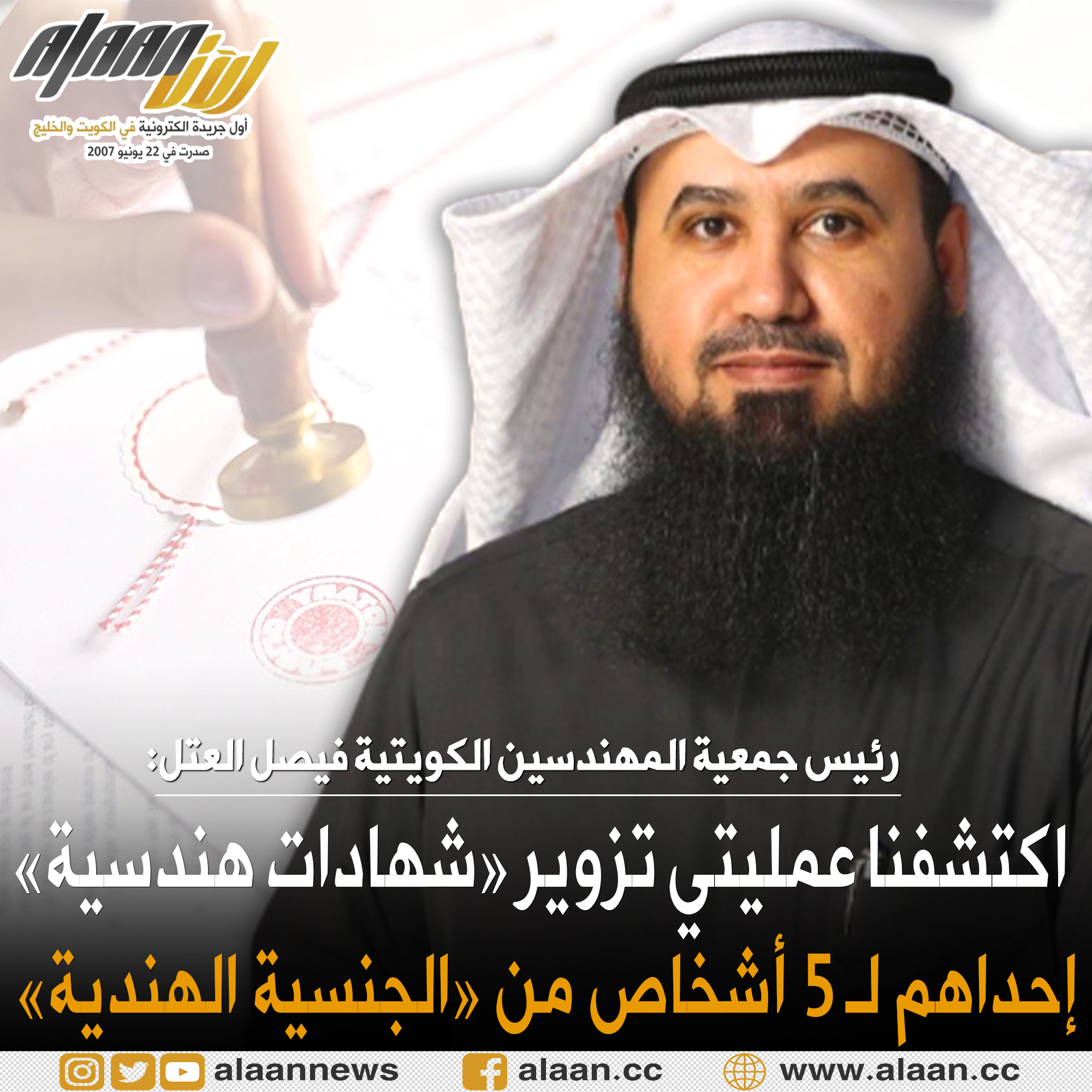 أعلن رئيس جمعية المهندسين الكويتية فيصل العتل عن اكتشاف عمليتي تزوير شهادات هندسية، متهم فيهما 5 أشخاص من الجنسية الهندية.