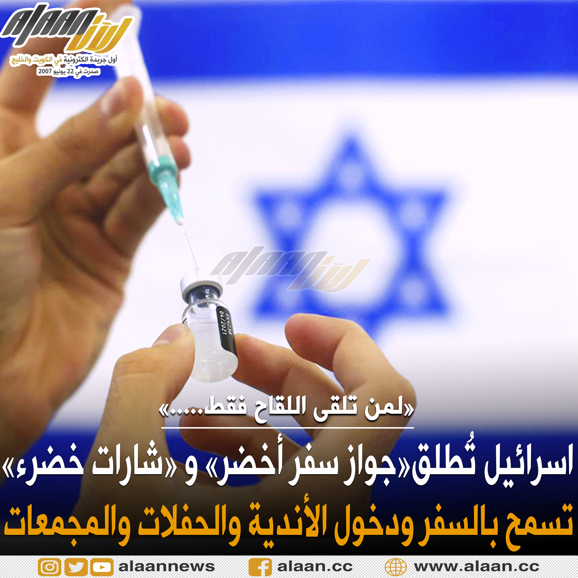 #إسرائيل تلقح 4 #ملايين نسمة وتطلق #خطة «الشارة الخضراء» #المثيرة_للجدل والتي تسمح لمن يحملها #فقط بدخول الأندية الرياضية و#المطاعم و#الحفلات وتطلق «جواز سفر أخضر» يسمح لهم بالسفر وتفتح #المجمعات و#المتاحف بـ «الشارة البنفسجية»