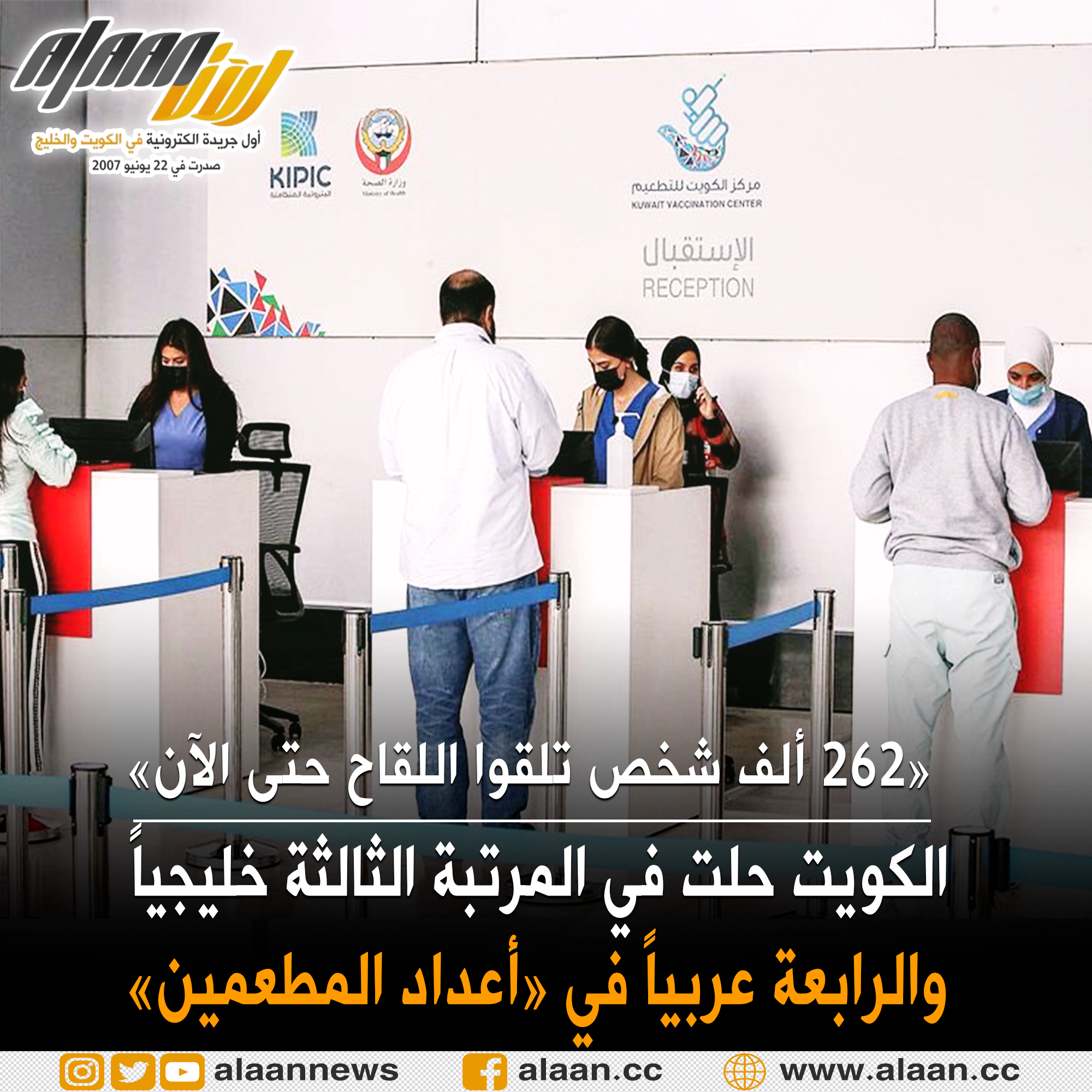 وحلت الكويت في المرتبة الثالثة خليجيا والرابعة عربيا في أعداد من تلقى التطعيم، حيث جاءت دولة الإمارات العربية المتحدة في المرتبة الأولى عربيا وخليجيا والثانية عالميا في الدول الأكثر تطعيما بأكثر من 6 ملايين تطعيم بنسبة 62% من تعداد السكان، فيما جاءت البحرين ثانية بنحو 300 ألف تطعيم وبنسبة 18% من عدد السكان.