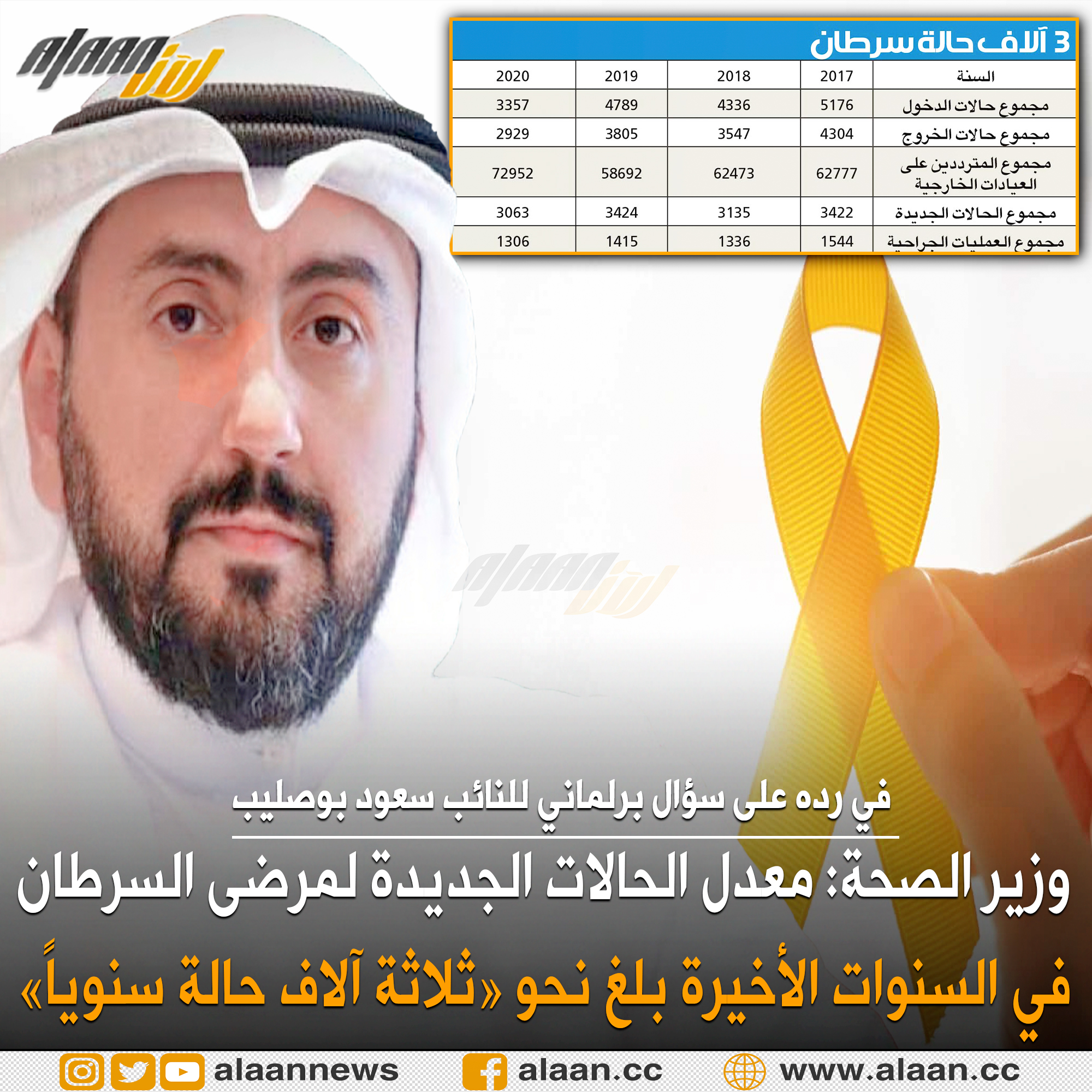 في رده على سؤال برلماني للنائب سعود بوصليب، كشف وزير الصحة الشيخ د. باسل الصباح أن معدل الحالات الجديدة لمرضى السرطان في السنوات الأخيرة بلغ 3 آلاف حالة سنوياً.