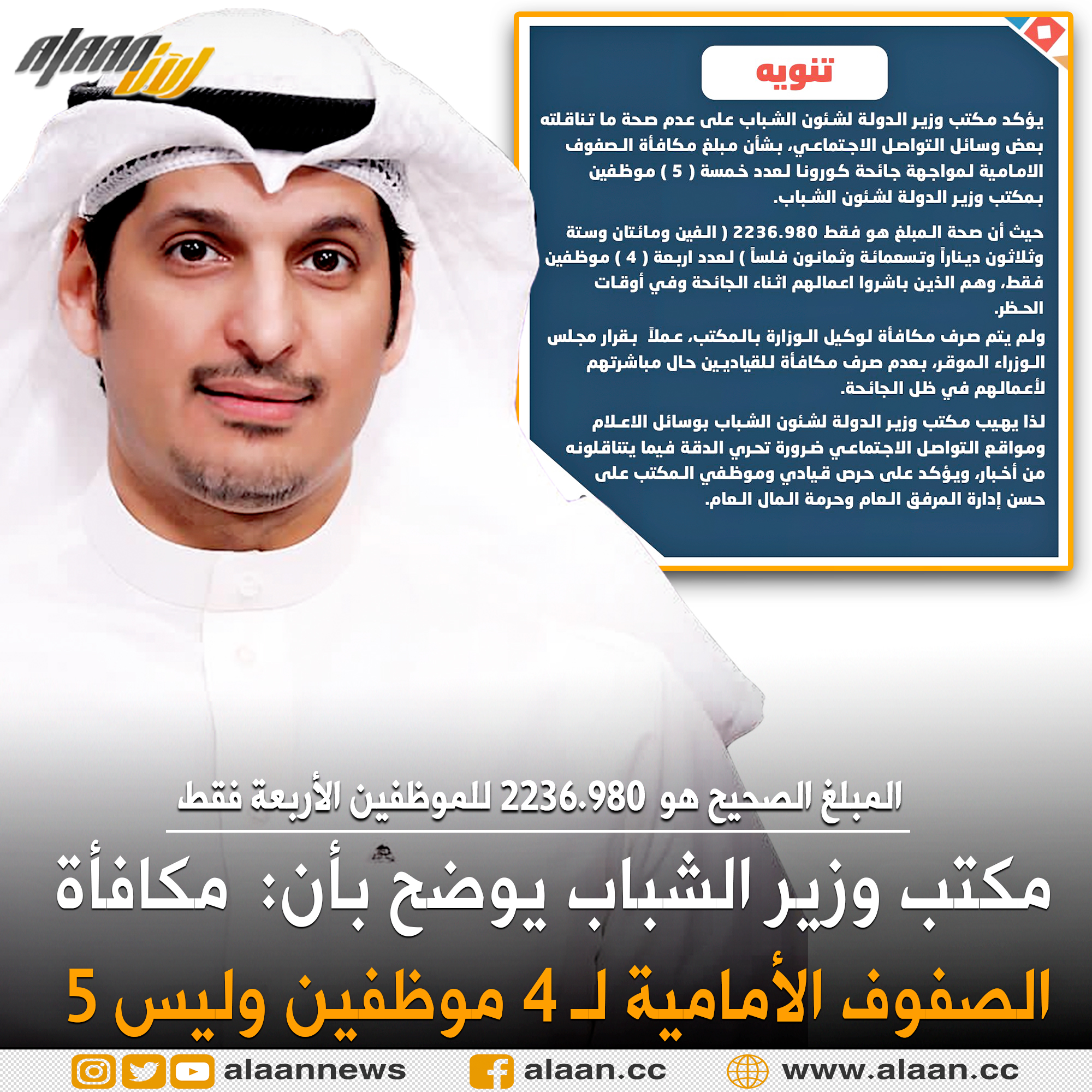أكد مكتب وزير الدولة لشؤون الشباب على عدم صحة ما تناقلته بعض وسائل الإعلام ووسائل التواصل الاجتماعي بشأن مبلغ مكافأة الصفوف الأمامية لمواجهة جائحة كورونا لعدد خمسة موظفين بمكتب وزير الدولة لشئون الشباب.