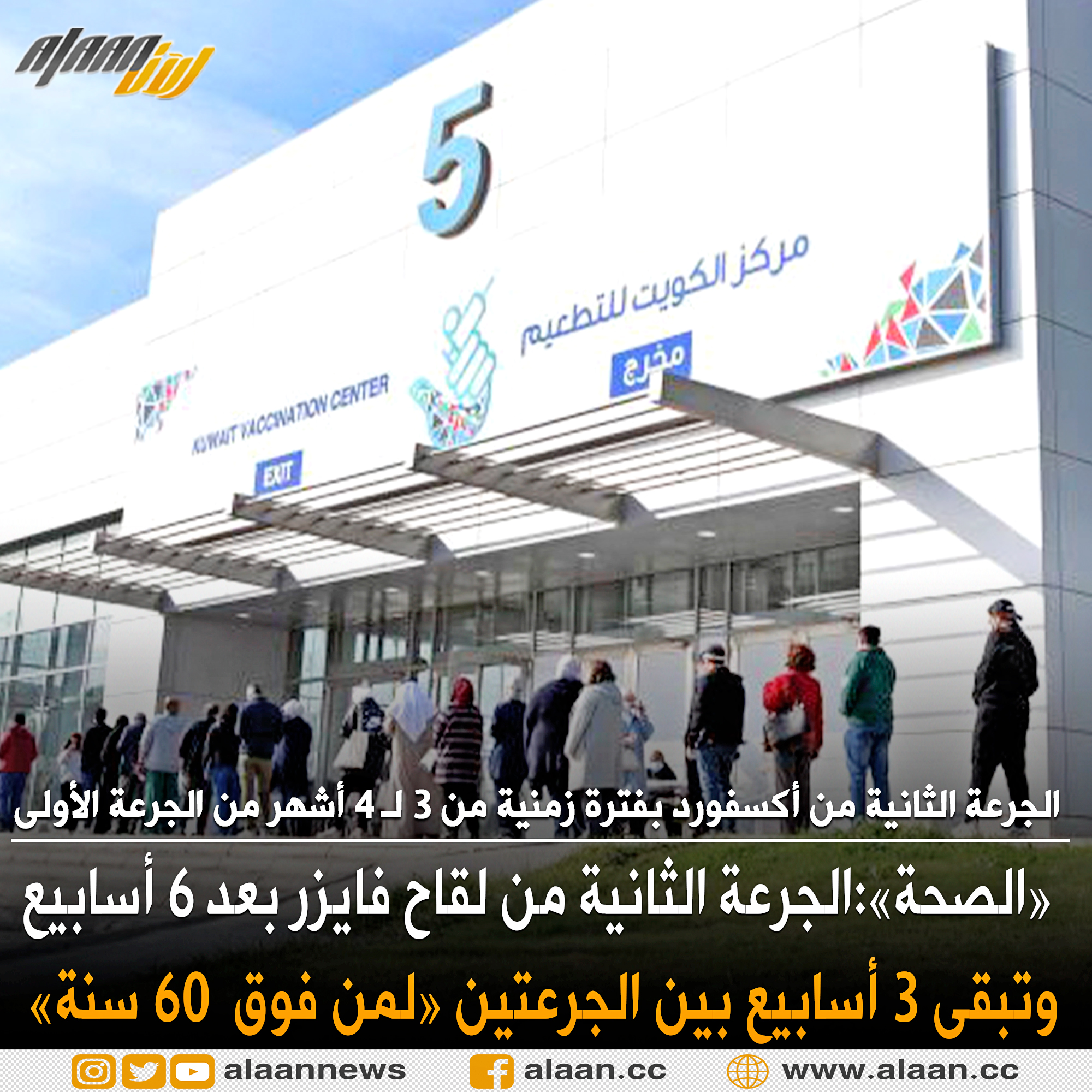 قررت وزارة الصحة تمديد إعطاء الجرعة الثانية من لقاح فايزر-بيونتيك لتكون بعد 6 أسابيع من الجرعة الأولى، على أن تبقى 3 أسابيع بين الجرعتين لمن تفوق أعمارهم على 60 سنة، ولأصحاب الأمراض المزمنة، موضحة أن ذلك يأتي في ظل التنافس العالمي للحصول على كميات وافرة من اللقاحات.