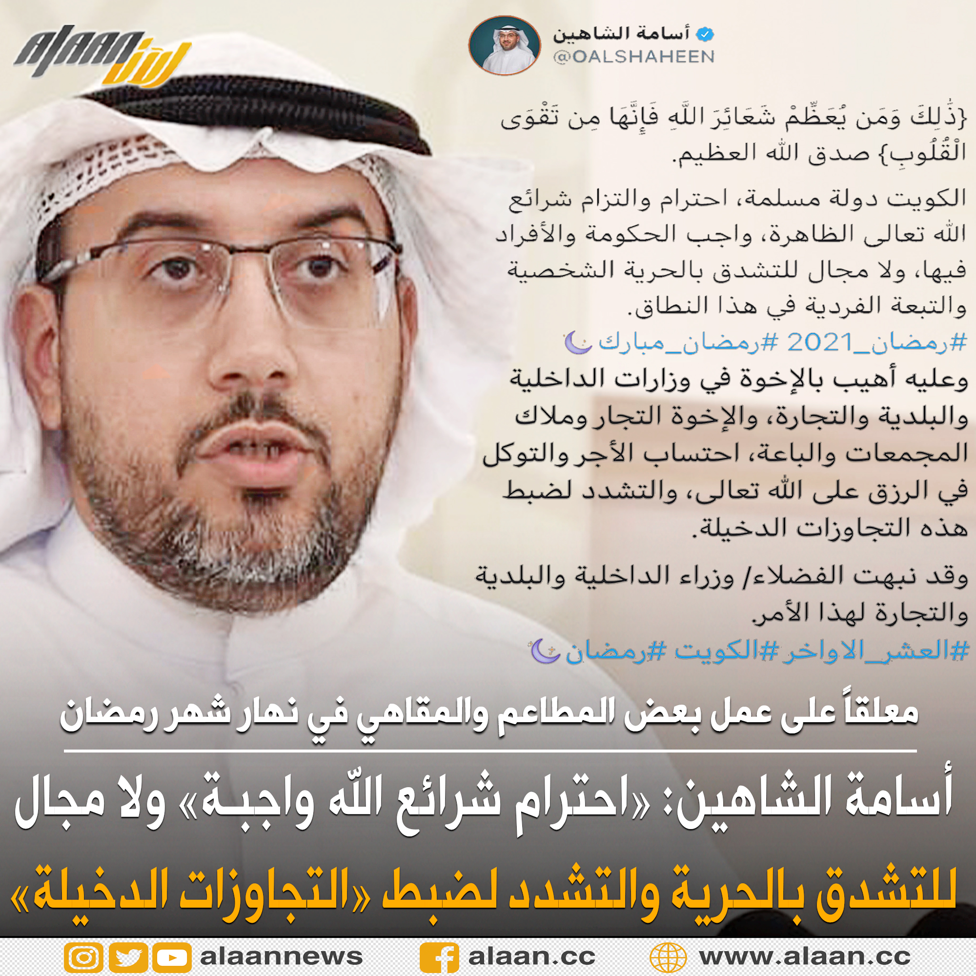 جاء هذا تعليقاً على عمل بعض المطاعم والمقاهي في نهار شهر رمضان المبارك، وقد أهاب النائب «وزارات الداخلية والبلدية والتجارة، والإخوة التجار وملاك المجمعات والباعة، احتساب الأجر والتوكل في الرزق على الله تعالى، والتشدد لضبط هذه التجاوزات الدخيلة». موضحاً بأنه قد نبه وزراء الداخلية والبلدية والتجارة لهذا الأمر.