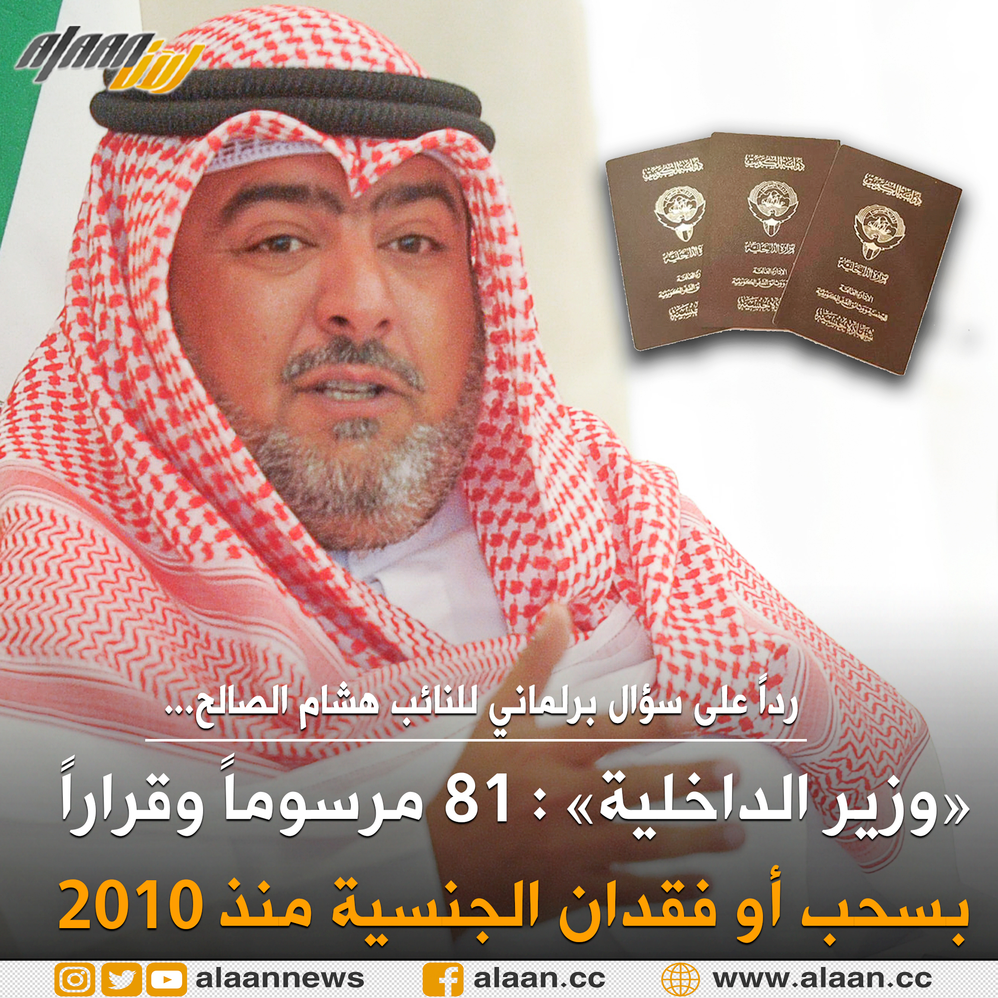 وفي رد على سؤال برلماني للنائب هشام الصالح، أوضح العلي أن «المراسيم والقرارات الصادرة بسحب أو فقدان الجنسية منذ عام 2010 بلغت 81 وجميعها صدرت وفق أحكام المواد 9 - 10 - 11 - 13 - 21 مكرر (1) من المرسوم الأميري رقم 15 لسنة 1959 بقانون الجنسية الكويتية».