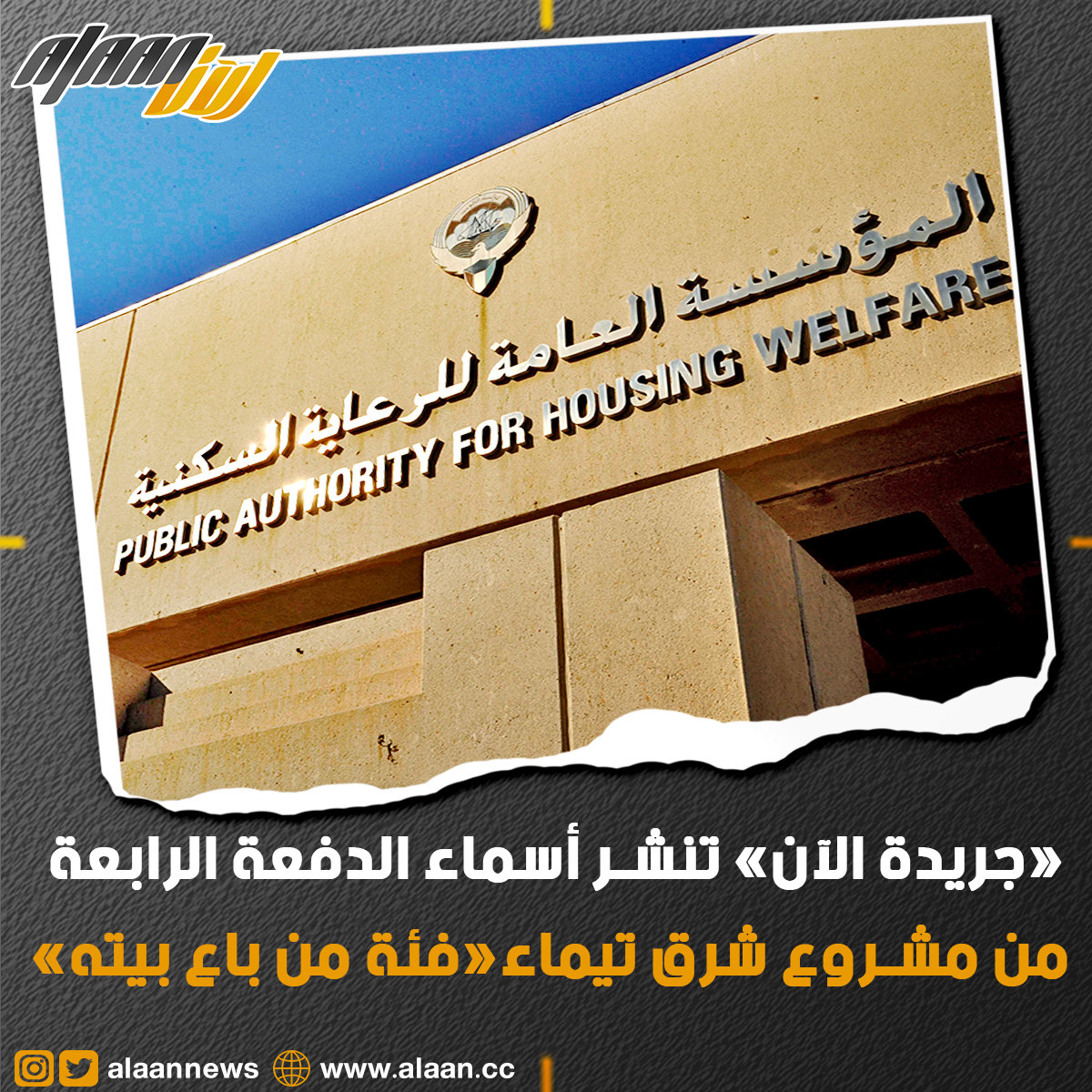 أعلنت المؤسسة العامة للرعاية السـكنية بأنها ستقوم بتوزيع الدفعة الرابعة من مشروع شرق تيماء، وفق قانون رقم (2/2015)، فئة من باع بيته، والتي تشتمل على (97) بيتاً للمخصص لهم حتى تاريخ 15/8/2006.