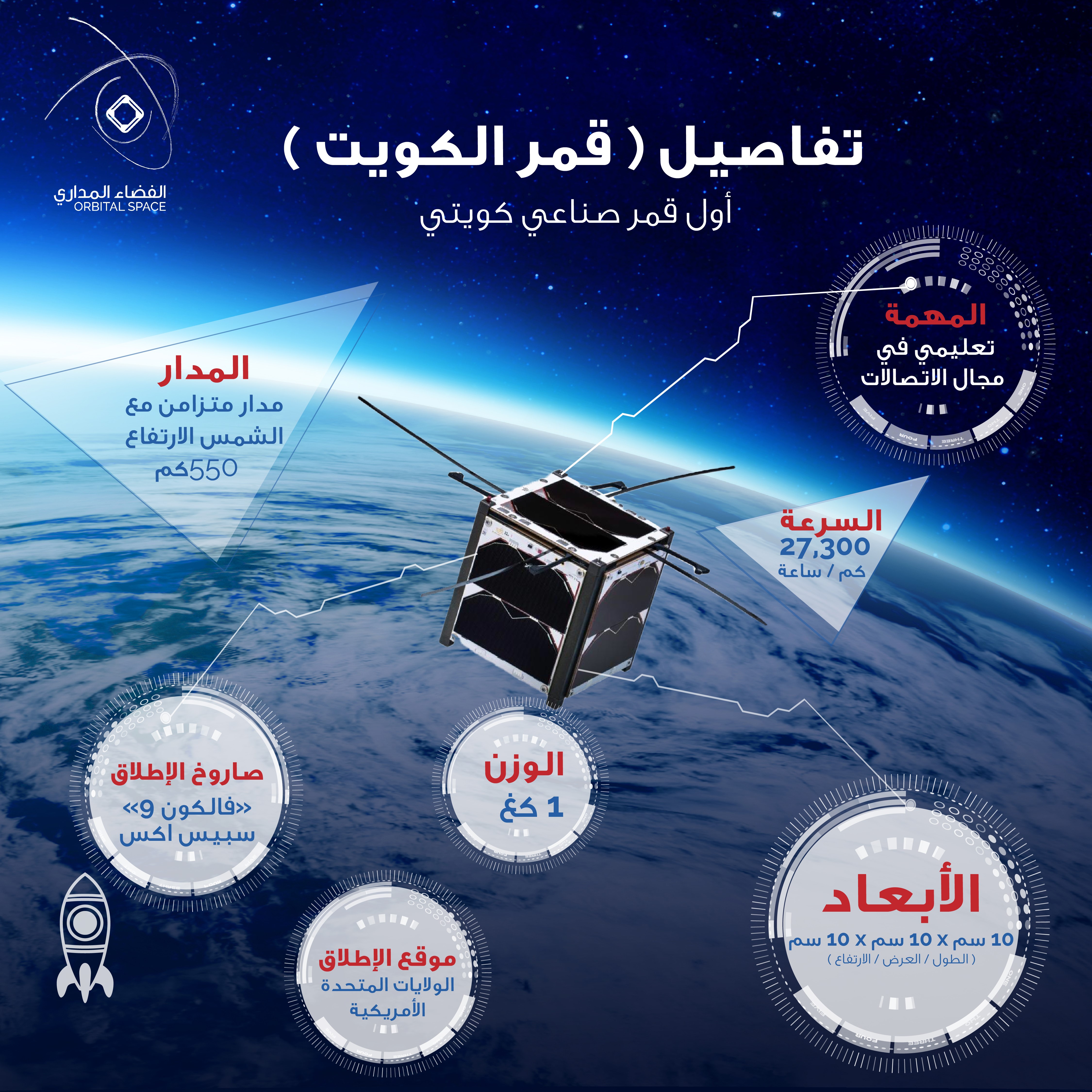 وقال "يعتبر قمر الكويت قمر اصطناعي تعليمي بحجم متناهي الصغر او نانومتري ويعرف هذا النوع أيضا باسم قمر اصطناعي مكعب او كيوب سات ويبلغ حجم القمر الاصطناعي 10 سنتيمتر مكعب ووزنه 1 كيلو غرام وسيتم وضعه على مدار متزامن مع الشمس وهو احد أنواع المدارات القطبية".