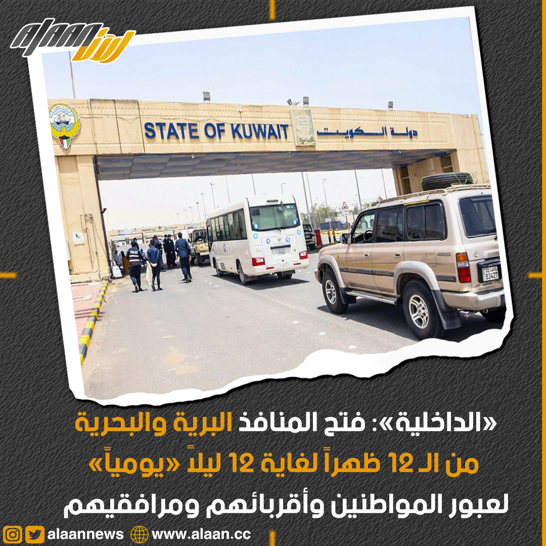 أعلنت وزارة الداخلية فتح المنافذ من 12 ظهراً لمنتصف الليل يومياً، وذلك مع انطلاق العمل في قرار السماح بعبور المواطنين وأقربائهم من الدرجة الأولى ومرافقيهم من العمالة المنزلية المحصنين الحدود البرية والبحرية.