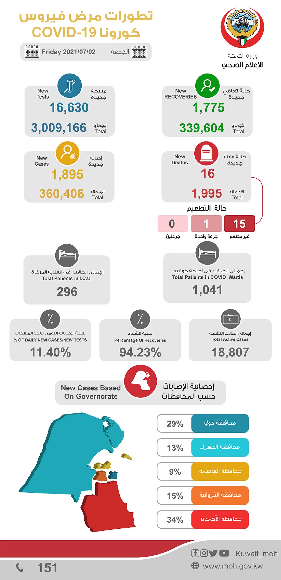 تعلن #وزارة_الصحة عن تأكيد إصابة 1,895 حالة جديدة، وتسجيل 1,775 حالة شفاء، و 16 حالة وفاة جديدة بـ #فيروس_كورونا_المستجدّ COVID-19 ، ليصبح إجمالي عدد الحالات 360,406 حالة